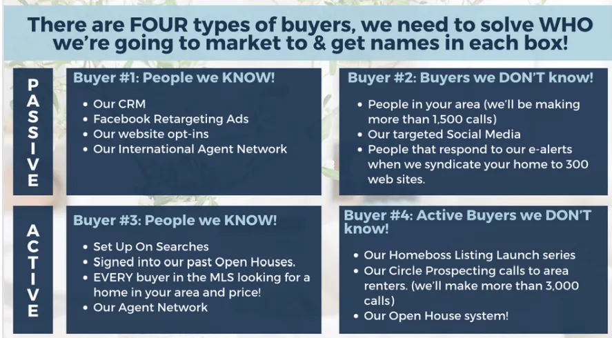 We break down the entire pool of buyers into four categories. Let me show you how we do it. There are active buyers, passive buyers, people we know, and people we don't know.